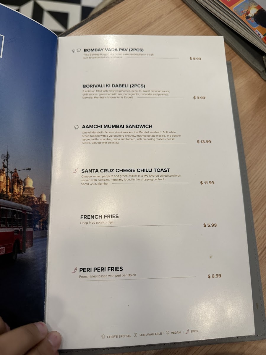 The Bambai Nagri section showcases iconic Mumbai street snacks such as the Aamchi Mumbai Sandwich, a layered sandwich with mashed potato masala and molten cheese, and other items like Bun Maska and French Fries. These items serve well for casual snacking or light meals.