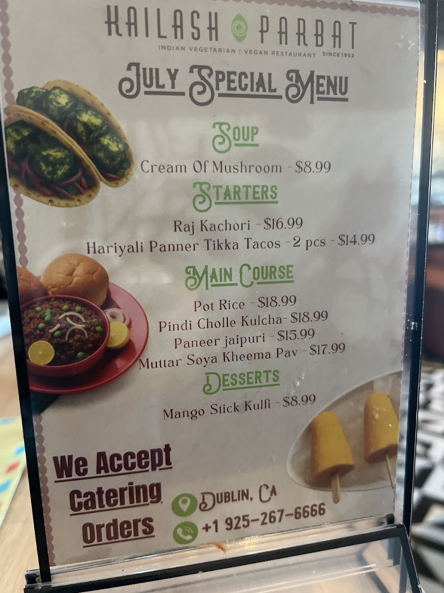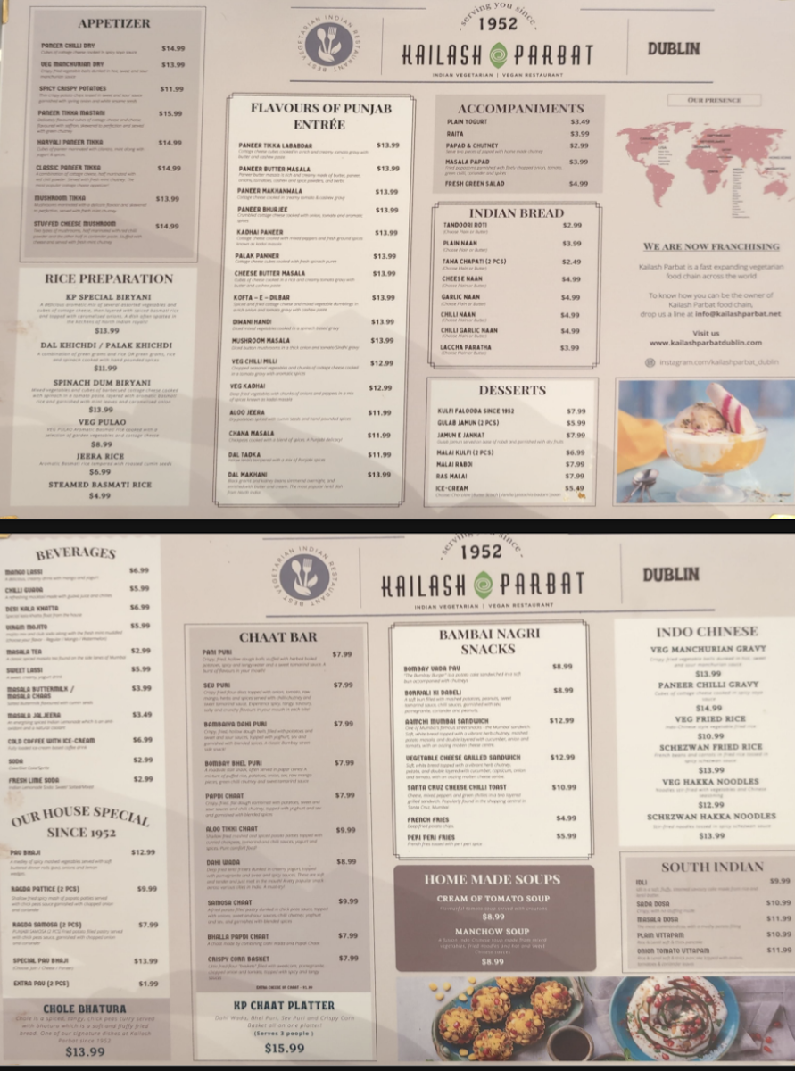 The menu at Kailash Parbat Dublin features a diverse selection of North Indian and Mumbai-style street foods, with a strong emphasis on vegetarian dishes. It is organized into several key sections to offer a range of tastes and meal options suitable for different dining occasions, including quick bites, light meals, and more substantial dishes.